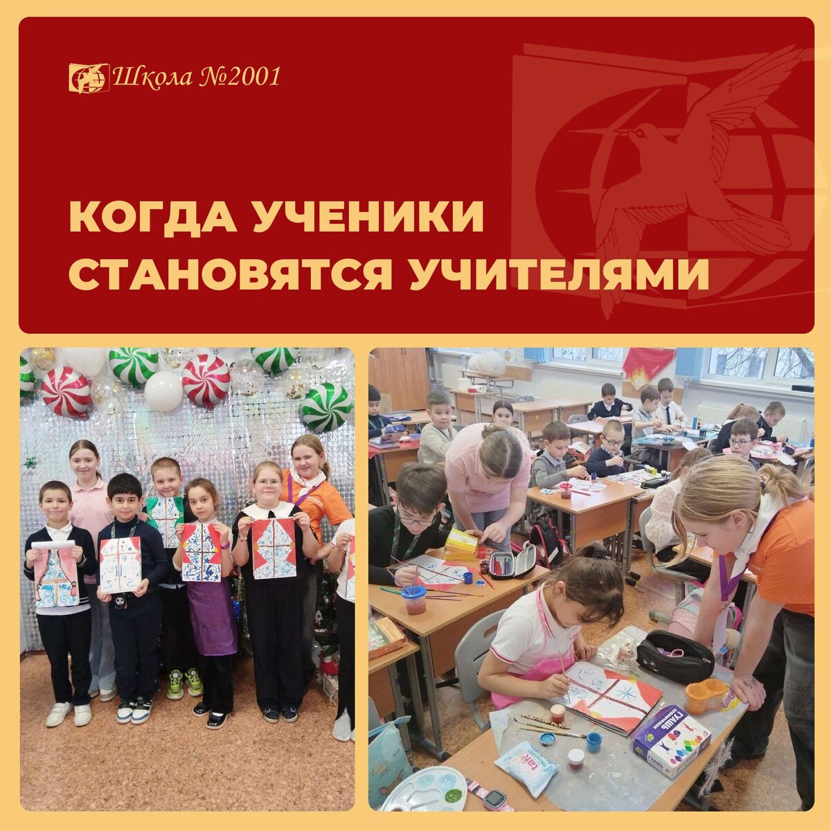 Ученицы 4 «Е» класса Анфиса и Саша попробовали себя в новой роли — они провели урок рисования во 2 «Г» классе на тему «Морозный узор»