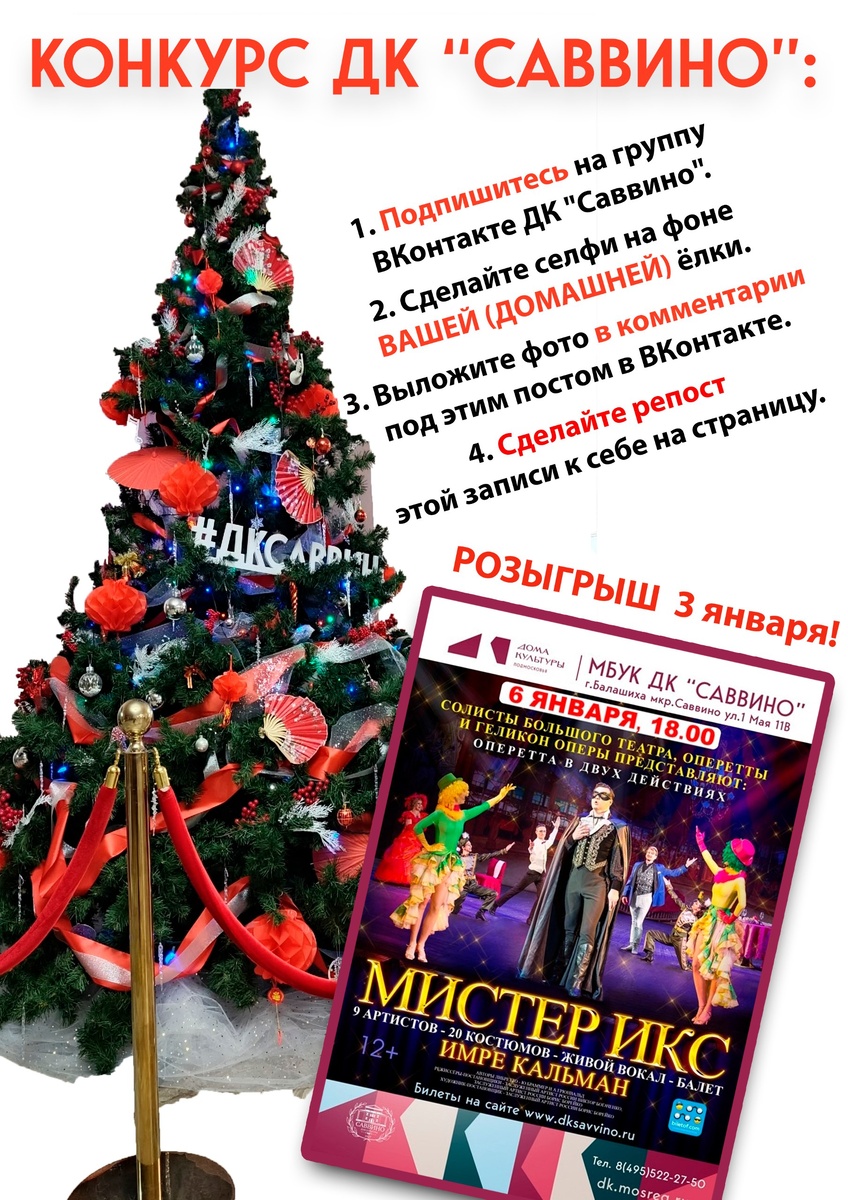 » 🎉✨ Мы рады объявить о старте акции «Моя ёлка» в Доме культуры «Саввино»! 🎄 📸 Условия участия в группе ВКонтакте https://vk.com/dk_savvino?w=wall-105667204_6944 1. Подпишитесь на группу ВКонтакте ДК "Саввино" https://vk.com/dk_savvino?w=wall-105667204_6944 2. Сделайте селфи на фоне ВАШЕЙ (ДОМАШНЕЙ) ёлки. 3. Выложите фото в комментарии под этим постом в ВКонтакте. 4. Сделайте репост этой записи к себе на страницу. ВАЖНО: Убедитесь, что ваши страницы открыты для участия в розыгрыше. 🎁 Приз: 2 билета на оперетту «Мистер Икс», которая пройдёт в ДК «Саввино» 6 января в 18:00. 🗓 Дата розыгрыша: 3 января. Победители будут выбраны случайным образом с помощью рандомайзера. ⚠ Внимание! Для участия необходимо соблюсти все условия. 🎉 Присоединяйтесь к акции «Моя ёлка» и делитесь праздничным настроением вместе с ДК «Саввино»!