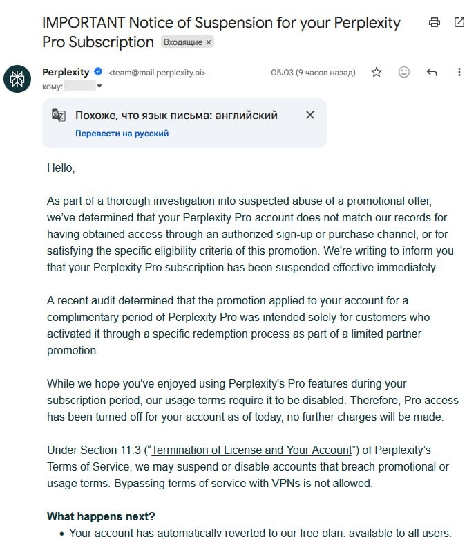 Коз*ы. Закончилось мое сладкое время Pro подписки в Perplexity. Брал за 800 руб. на год, официальная подписка 20 баксов в месяц. Увы, посмотрим будут ли еще потайные ходы для более дешевого использования, но если нет, то китайские ИИ буду юзать.