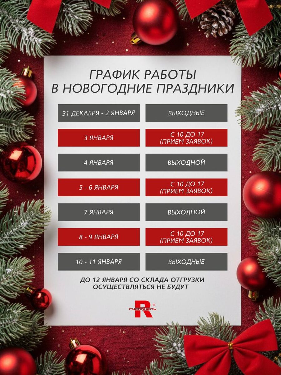 ☝️ Наш график вы можете увидеть на картинке. А если остались вопросы – свяжитесь с нами 😉 До 12 января со склада отгрузки осуществляться не будут. 📩 ruspanel.ru 📞 8 800 222-12-52 #Руспанель_полезное