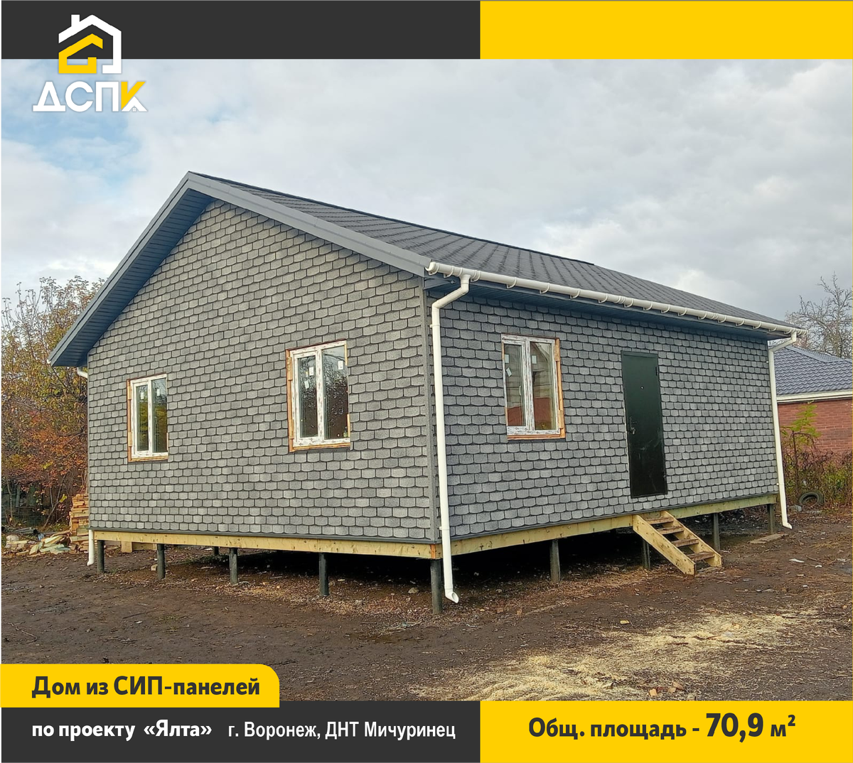Дом из СИП панелей по проекту «Ялта» бригада «ДСПК» построила в ДНТ «Мичуринец». Это черта города и использовать дом можно не только для летнего отдыха, но и для постоянного проживания. По желанию заказчика в типовой проект было внесено изменение. Изначально в «Ялте» предусмотрена большая терраса. От террасы решили отказаться в пользу увеличения жилой площади. 📍Площадь дома: 70,9 м2. 📍Размеры: 9 х 7,875 м. 📍Высота потолка: 2,5 м Фундамент: - Винтовые металлические сваи 108 мм, цементно-песчаная засыпка, оголовок 250х250 мм - Обвязочный брус/доска 200х200 мм Пиломатериал: - Камерная сушка с обработкой огне-биозащитой Neomid - Калиброванный брус/доска Сборка дома из СИП панелей: - пол, внешние стены, чердачное перекрытие СИП 174 мм - внутренние стены СИП 174/124 мм Монтаж кровли: - Мягкая черепица Shinglas от Технониколь Внешняя отделка: - Фасадная плитка Технониколь Hauberk с вентиляционным зазором. Оконные конструкции: - ПВХ Rehao 70 мм, 2-х камерный стеклопакет. Хотите узнать подро