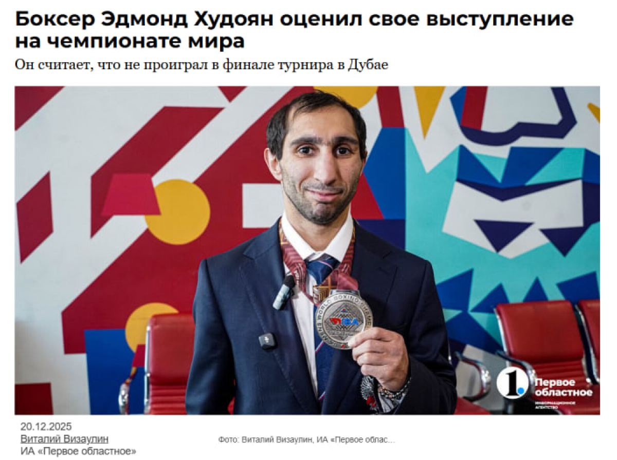 Открывает наш хит-парад самая свеженькая новость, а в центре ее внимания оказался боксер Эдмонд Худоян. На чемпионате мира IBA спортсмен из Златоуста завоевал серебряную медаль. В равном бою в финале он уступил сопернику из Азербайджана.