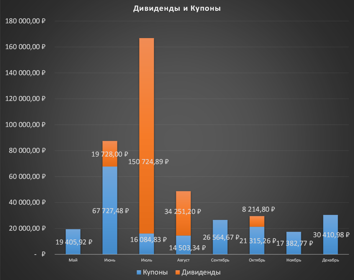 Решил подвести итоги — посчитать, сколько пришло дивидендами и купонами в этом году, и получил цифру 426 314 руб. Из этой суммы пришло купонами — 213 395, а дивидендами — 212 919 руб. Я сам удивился — но выплаты купонами почти равны полученным дивидендам. Стратегии &Дивиденды_и_Купоны_Prime в этом году исполнилось 8 месяцев, и если разделить 426 314 рубля на 8 месяцев — получим, что стратегия приносила примерно 53 289 рублей ежемесячного пассивного дохода. Лично я считаю, что эта сумма — неплохая прибавка к зарплате, и год для стратегии прошёл достаточно неплохо. Также предвижу вопросы «мамкиных инвесторов» типа: «Какая доходность? Сколько процентов?» — и всё в таком духе. Отвечу сразу: я не гоняюсь за доходностью, процентами и прочими «средними» показателями. Моя цель — получать конкретный доход в конкретной сумме денежных средств. И дополнительные 53 289 рублей ежемесячно — это хороший результат, даже если какой-нибудь «мамкин инвестор» высчитает доходность 10%, 5% или даже 1% годо