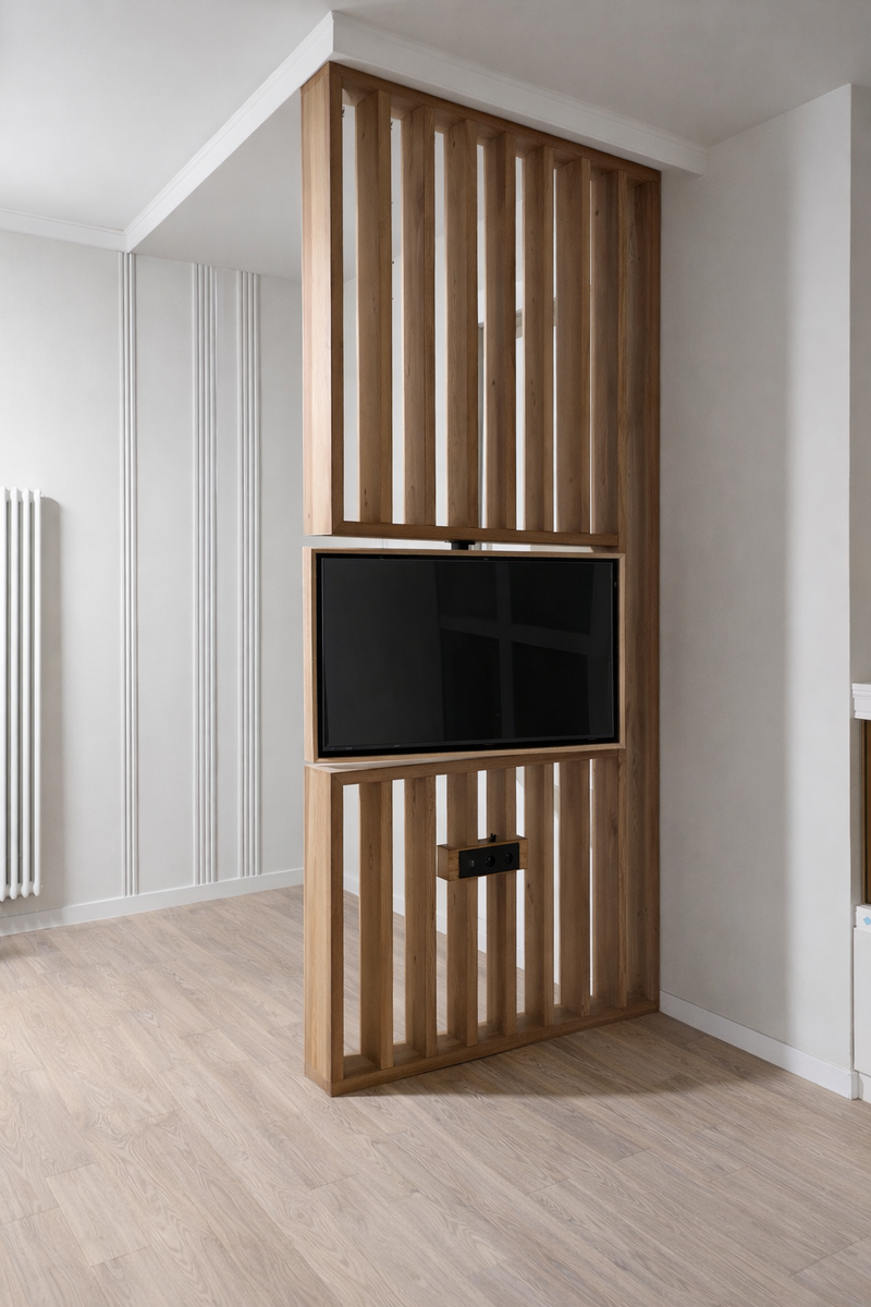 Современный интерьер — это не про количество мебели и декора. Это про то, как пространство работает на человека. Один из лучших примеров такого подхода — перегородка из натурального дерева с поворотным телевизором.