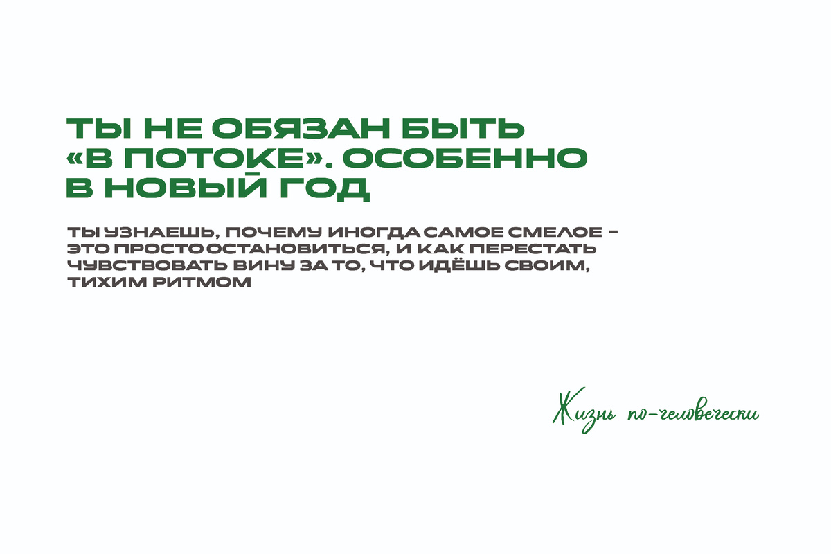 - Не ставишь цели - значит застываешь И вот ты уже сидишь и думаешь, что итак тяжело держаться на плаву, а тут я должен еще ворваться в поток Ты человек и тебе не нужно быть "в потоке". Иногда важнее - не упасть. А не то чтобы ворваться в поток Поток - это как новая религия, в которой все верят, что если не расти, то ты начнешь отставать, если ты не подстроишься - то душой умрёшь и если ты не в этом неком потоке - то ты не живёшь. (Прости уж меня за столь громкие слова) Но вся правда в том, что так называемый "Поток" - это привилегия тех, у кого есть ресурс, опора и силы на эксперименты. Так что рассчитывай правильно свои силы. Не делай поспешных ходов Если ты выжил в 2025 году, если не предал себя до конца, ты уже в своём потоке, просто он тихий Мир кричит тебе: "Меняйся! Двигайся! Стремись! Достигай!" Но вот что скажу, самый смелый поступок - остановиться. Остановка - это вовсе не лень. Эт