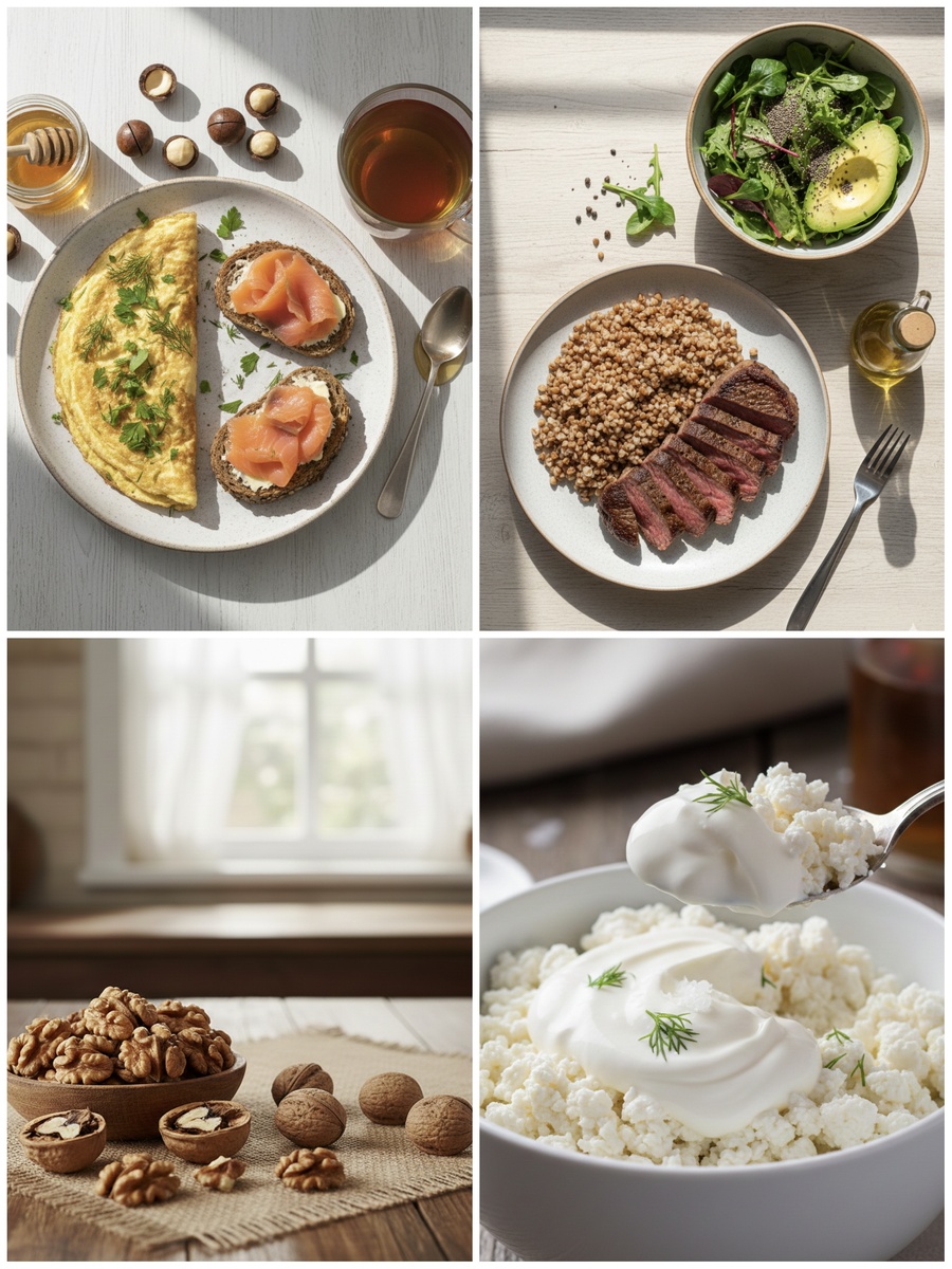 2 бутерброда из цельнозернового хлеба с семенами + сливочное масло + жирная красная рыба, омлет из нескольких цельных яиц, чай с мёдом и орехи макадамия «в догонку»