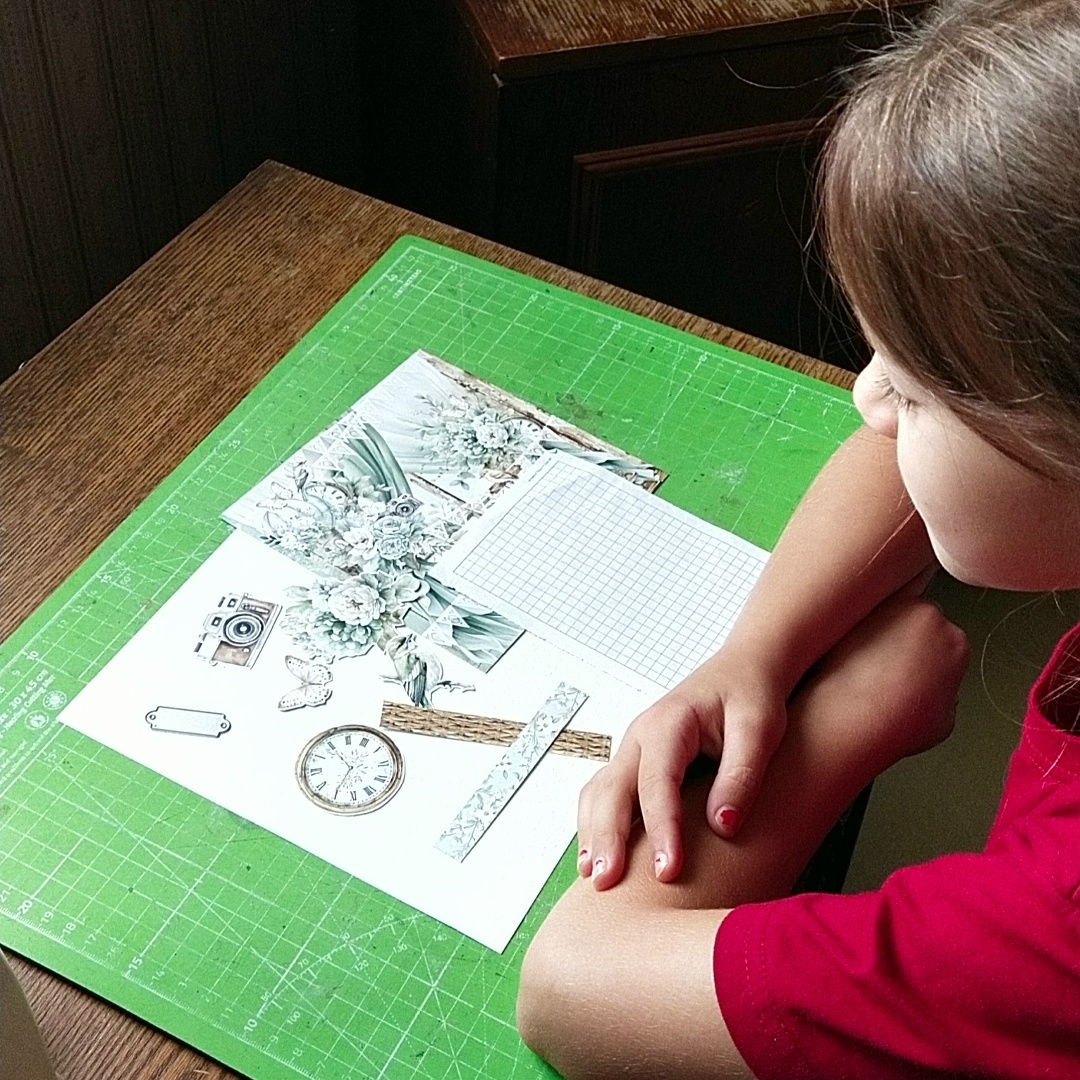 У меня зазвонил телефон. Кто говорит? Нет, не слон. Говорит Аленка. Всем привет! С вами сегодня Анна Новикова и моя (уже восьмилетняя) внучка Алёнка. И вот так, как написано вначале, началась эта творческая история. Позвонила Алёнка и сказала, что очень хочет сделать для Маши (старшая сестра) открытку. А день рождения уже завтра и сделать нужно сегодня, чтобы утром подарить. Попросила я её подождать, когда закончу своё дело, но долго ждать Алёна не хотела и примерно через полчаса пришла. Пришлось бабушке Ане откладывать свои дела и заняться скрапом с внучкой. Всё было спонтанно, поэтому не судите нас строго за маникюр и другие промахи. А мы вам сейчас всё расскажем и покажем. Как обычно и бывает, работа над открыткой началась с выбора бумаги. Бабушка предложила несколько вариантов и выбор пал на набор «Rustic Charms» от Mintay Papers. Алёнка пришла в такой восторг от этой бумаги, что никакой другой вариант уже не рассматривала. Кроме самой бумаги выбрали вырезанные элементы из этой кол