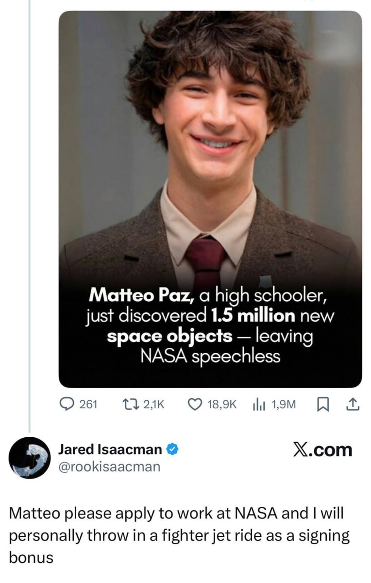 А потом получил предложение о работе от самого главы NASA. Маттео Паз из Пасадены параллельно со школой проходил обучение в Planet Finder Academy при Калифорнийском технологическом институте. Там он решил проанализировать данные инфракрасного телескопа NEOWISE. Аппарат более 10 лет сканировал небо в поисках астероидов, попутно фиксируя переменные объекты — квазары, вспыхивающие звёзды и двойные системы. Эти данные оставались невостребованными из-за их колоссального объёма (около 200 млрд строк). Всего за шесть недель ИИ-модель Маттео выявила сотни тысяч квазаров, вспышки сверхновых и другие объекты, которые раньше оставались невидимыми. Результаты после проверки приняли к публикации в одном из ведущих профильных изданий The Astronomical Journal. После этого школьнику предложили работу ассистента-исследователя в Caltech. Кроме того, глава NASA в качестве бонуса пообещал Маттео полёт на реактивном истребителе.