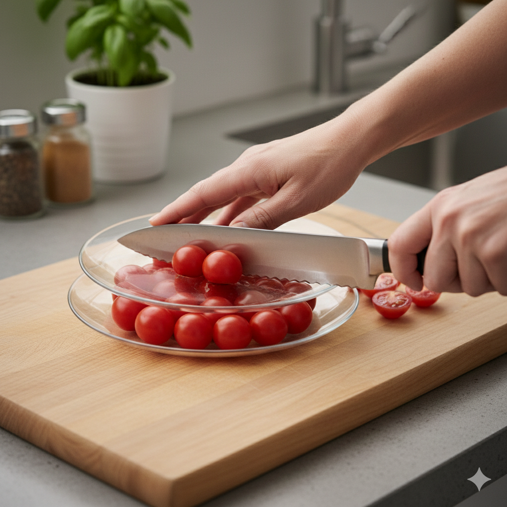Если вам нужно нарезать целый стакан маленьких помидоров для салата, делать это по одному — долго и нудно. Есть профессиональный поварской трюк, который позволит разрезать сразу десяток черри за одно движение. Что нужно сделать: Почему это работает: Две параллельные плоскости удерживают круглые плоды на одном уровне и не дают им перекатываться. Нож проходит ровно посередине, разделяя все помидоры на аккуратные половинки одновременно. Этот же метод отлично работает с виноградом или оливками без косточек. Лайфхак: Используйте нож с зубчиками (серрейтор), если кожица у помидоров слишком плотная — он не раздавит их, а аккуратно пропилит.