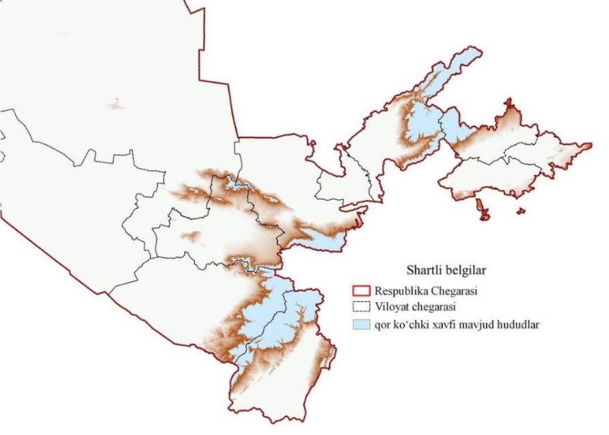 : 🔹Qashqadaryo viloyati: Dehqonobod, Kitob, Qamashi, Shahrisabz tumanlarida; 🔹Surxondaryo viloyati: Boysun, Qumqo‘rg‘on, Sariosiyo, Uzun tumanlarida; 🔹Samarqand viloyati: Nurobod, Qo‘shrabot, Samarqand, Urgut tumanlarida; 🔹Jizzax viloyati: Baxmal, Zomin tumanlarida; 🔹Toshkent viloyati: Bo‘stonliq, Parkent, Ohangaron tumanlari (Chotqol tizmasi tog‘lari); 🔹Namangan viloyati: Pop tumanida. @daryolive