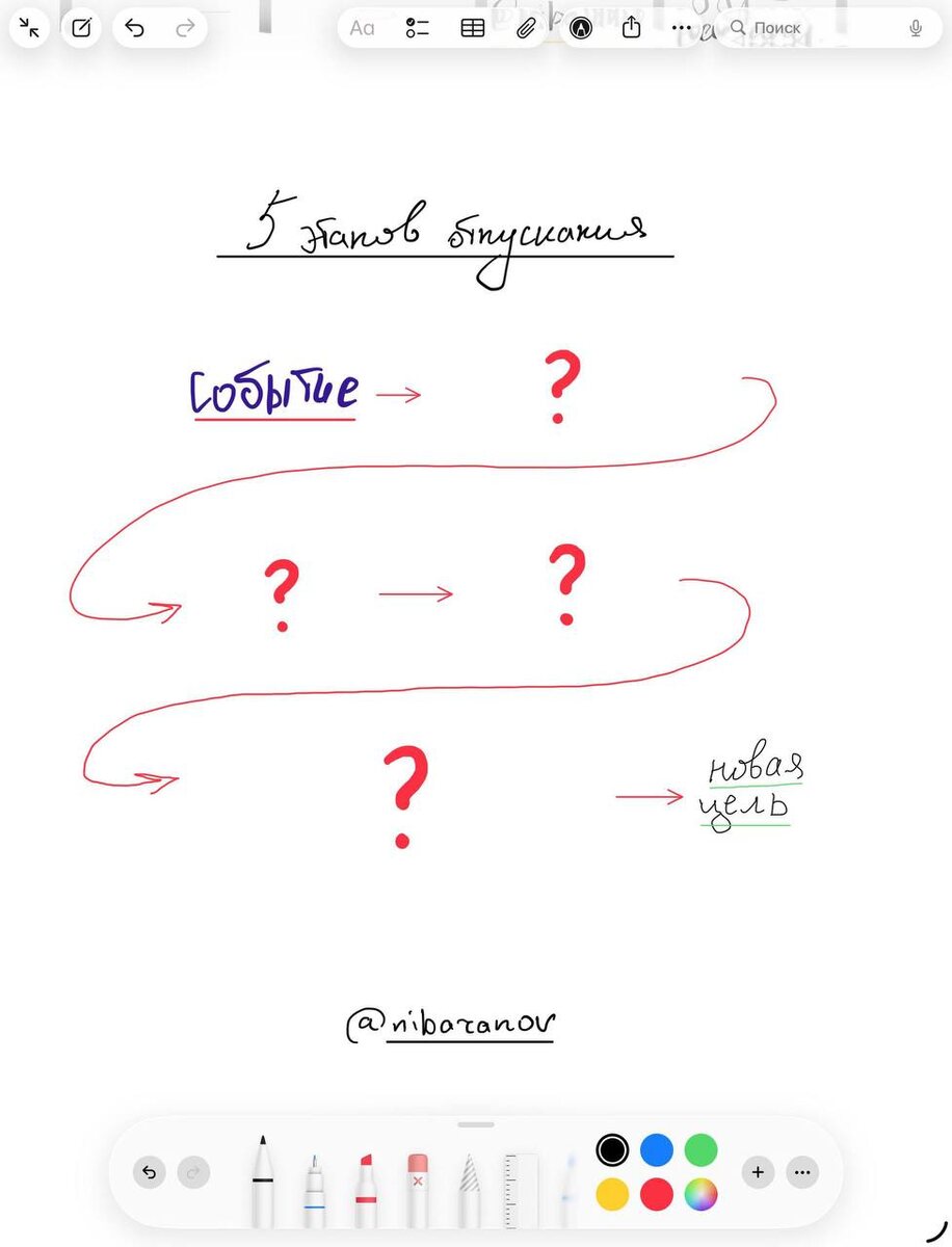 📍Обещал вам практику 📍Написал вам практику 📍Даю вам практику 😅 Все просто)) Давайте начнем с начала… Двигаться с вами будем по этой схеме, и на каждом этапе раскроем новое задание ☑️ Что нужно сразу увидеть?? Между первым этапом «событие» (а может их много) и финальным этапом «новая цель» есть еще 4! В этом огромная ошибка многих. Переходить в новые цели не отпуская старого. Ну, или даже не пытаясь этого делать. Поэтому, коротко предложу вам 5 этапов, которые мы каждый день пройдем, чтобы вам было легче двигаться дальше! Шаг 1: Выпишите для начала события, которые хотели бы отпустить перед переходом в Новый год 🎄 Да, так просто. Нет, только события - это все то, что вызывает чувства (ситуации, чувства, людей)! Можно просто в заметки 📝 Что делать дальше? Завтра расскажу 😅 @nibaranov, всех обнял! 🙏📿 з.ы.: рисую просо в заметках на iPad
