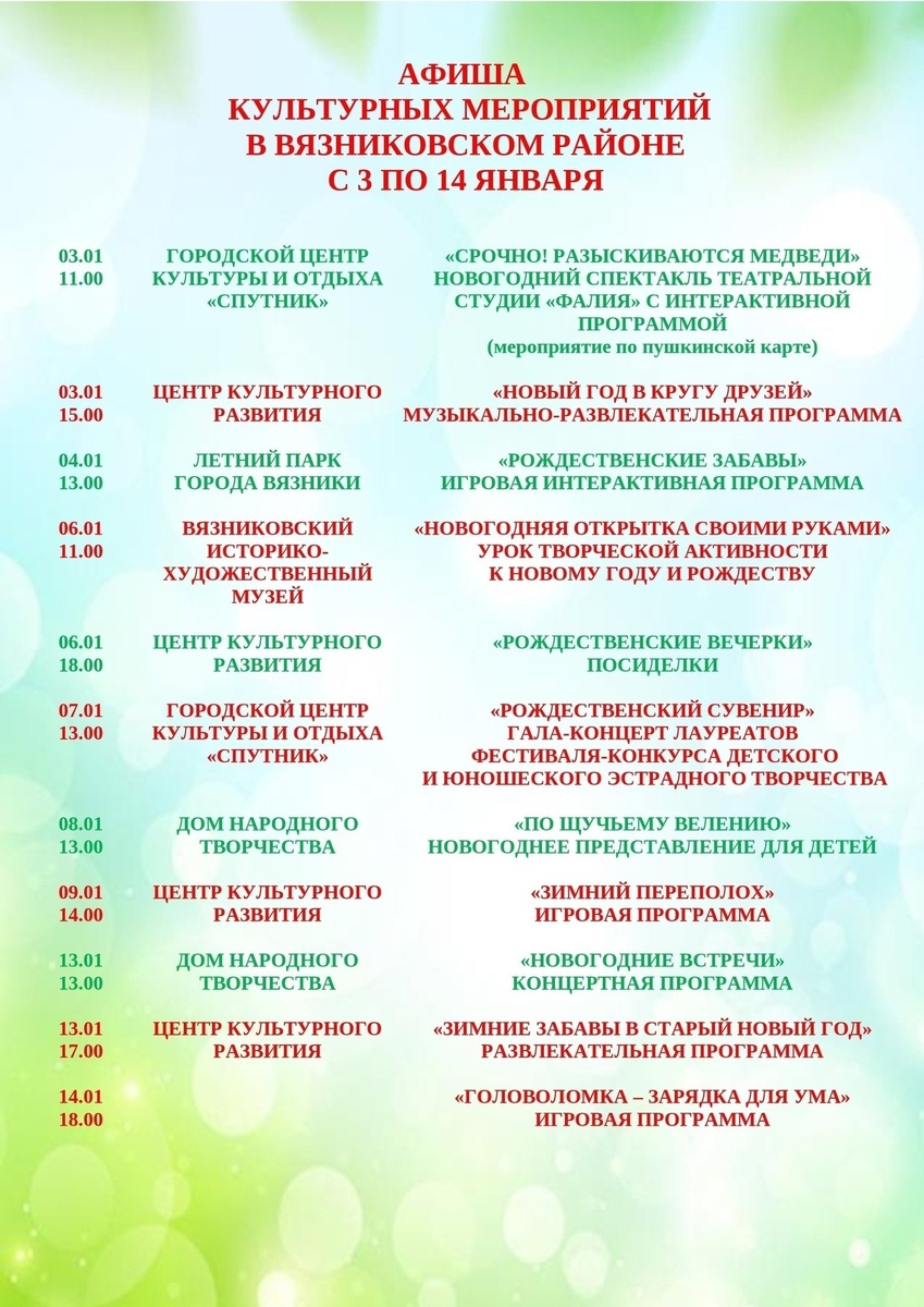 Афиша культурных мероприятий с 3-14 января.