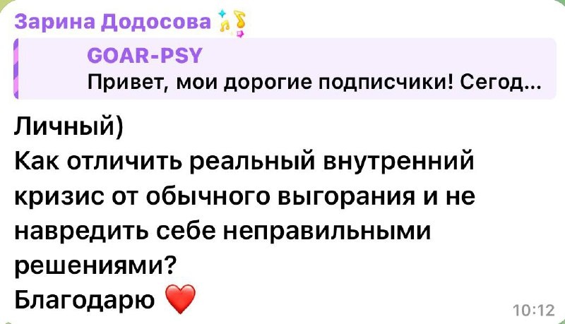 Возможно это будет полезно не только его автору. 📌📌📌📌📌📌📌📌📌📌📌📌 Хороший вопрос, действительно сложно развести эти два состояния: выгорание и внутренний кризис. А от пониманияпроблемы — зависит выбор методов. Давайте разбираться. 1. ВЫГОРАНИЕ: истощение из-за внешнего контекста Здесь источник проблемы — снаружи. 📍Как звучит: «Я ненавижу эту работу», «Меня бесит эта ситуация»,«Я больше не могу так». 📍 Как чувствуется: Раздражительность, хроническая усталость, цинизм, скрытая агрессия («всё бесит»), проблемы со сном. 📍 Что делать: На первых стадиях — система отдыха и восстановления границ. На поздних — к отдыху добавляются перемены (смена проекта, работы, режима). 2. ВНУТРЕННИЙ КРИЗИС: потеря внутренних ориентиров - здесь источник — внутри. 📍 Как звучит: «Кто я?», «Зачем мне всё это вообще?», «Что для меня важно?», «Это моя жизнь?». 📍 Как чувствуется: Пустота, потерянность, экзистенциальная неудовлетворённость (даже при успехе). Отдых часто усиливает тревогу — поэтому ин