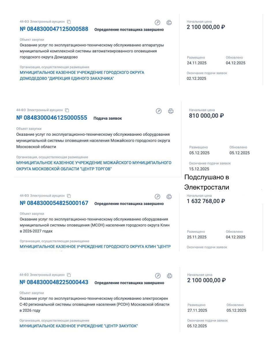 За последний месяц было обнаружено 10 запросов на услуги по техобслуживанию систем оповещения населения в московском регионе. Все эти закупки проходят по коду позиции 84.22.1 — «Услуги в области обеспечения военной безопасности». Соответствующие заказы размещены на портале госзакупок. Лидером по стоимости контракта стал Павлово-Посадский городской округ, администрация которого потратит на соотвествующие услуги больше 3,8 миллиона рублей. Меньше всего может потратить Черноголовка (почти 666 тысяч), однако цена еще может измениться, так как определение поставщика еще не завершено. Также в закупках встречаются городские округа Домодедово, Клин, Ленинский (2 раза) и Можайский, а также Раменский муниципальный округ и Электросталь. ⚡️ Как комментировать? ⭐ Написать администратору 🏷️ Фото ретро Электросталь 📣 Доска объявлений