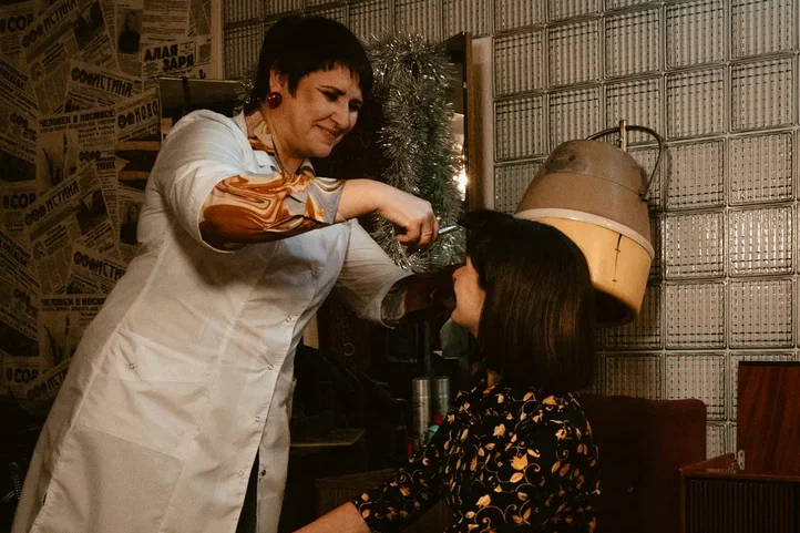 Прервав работу с клиенткой, мастер вспоминает, что в советские годы в предновогодние дни парикмахерские работали без перерыва: