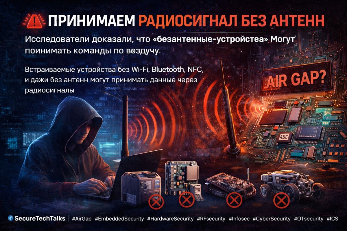 Исследователи доказали, что «безантенные-устройства» могут принимать команды по воздуху В кибербезопасности есть догма: если устройство физически изолировано от сетей, то оно безопасно. Air-gapped системы десятилетиями считались защищенными на физическом уровне. В конце 2025 года эта догма дала трещину. Исследователи опубликовали работу, в которой показали: встраиваемые устройства без Wi-Fi, Bluetooth, NFC и даже без антенн могут принимать данные через радио сигналы. 🔍 Начало Поводом для исследования стали странные наводки в embedded-устройствах: ADC-входы и GPIO иногда фиксировали «шум», который не объяснялся электрическими помехами. Команда решила проверить гипотезу: а что если устройство не просто ловит шум, а реально принимает радиосигнал? 🧪 Что именно проверяли Исследователи собрали 14 разных embedded-платформ: ➖промышленные контроллеры, ➖платы разработчиков, ➖аппаратные криптокошельки, ➖беспилотные системы. Устройства не имели: ❌ радиомодулей, ❌ микрофонов, ❌ инструмент