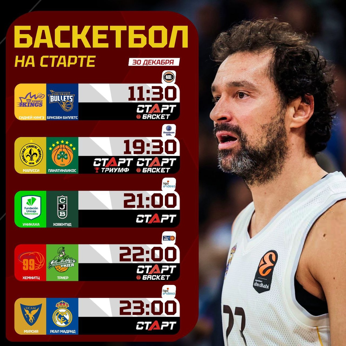 ! Начинаем вторник в Сиднее, где «Кингз» примут «Буллетс». Далее перерыв до вечера, который стартует в Греции. «Пао» завершит год выездом к «Марусси». Из Лиги АСВ посмотрим противостояние Малаги и Бадалоны, а также домашний матч «Реала» – мадридцы примут «Мурсию». Ну а в Германии «Триеру», чтобы удержаться в тройке, нужно будет обыграть «Хемнитц». Оставайтесь весь день на платформе TVSTART.RU 🖥 🛒 Наше приложение в Google Play 💙 Наше приложение в RuStore 🛒 Наше приложение в App Store
