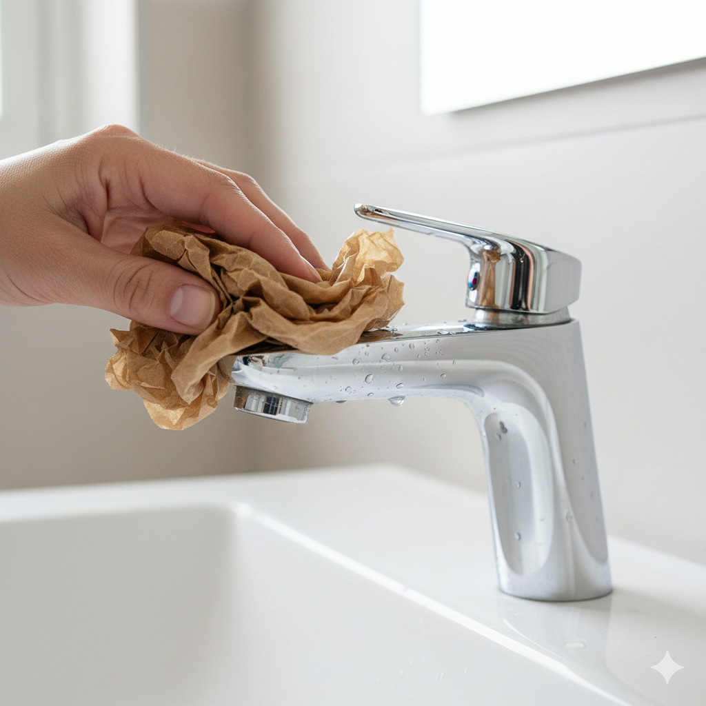 ОДНОЙ ЛЕВОЙ: Как очистить кран с помощью обычного пергамента **Что нужно сделать:** Возьмите лист обычной бумаги для выпечки (пергамента), скомкайте его в плотный шарик и просто потрите сухой смеситель или душевую лейку в тех местах, где видны пятна от воды и белесый налет. **Почему это работает:** Секрет в покрытии пергамента. Большинство видов бумаги для выпечки покрыты тончайшим слоем силикона, чтобы тесто не прилипало. При трении этот силикон работает как мягкий полироль: он счищает легкий известковый налет и создает на поверхности крана невидимую водоотталкивающую пленку. После такой процедуры капли воды просто скатываются, не оставляя новых следов. **Лайфхак:** Если налет очень сильный и старый, сначала оберните кран тряпкой, смоченной в уксусе, на 15 минут, а уже потом «отполируйте» сухим пергаментом для идеального блеска.