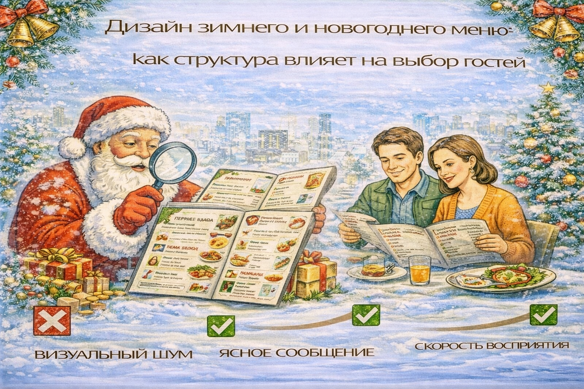 Зимний период и новогодние праздники меняют поведение гостей. Люди чаще приходят компаниями, дольше выбирают, готовы пробовать новое и легче соглашаются на дополнительные позиции. Именно поэтому дизайн и структура меню в это время начинают напрямую влиять на средний чек и общее впечатление от заведения. Ошибки, которые летом проходят незаметно, зимой начинают стоить денег. Разберём, как правильно выстроить дизайн зимнего и новогоднего меню, чтобы оно помогало гостю выбирать и заказывать больше. Одна из частых ошибок — просто добавить новогодние позиции в конец основного меню. В результате сезонные блюда теряются, а гость их не замечает. Зимнее меню должно быть либо отдельным блоком, либо отдельным носителем. Тогда внимание гостя фокусируется на новых предложениях. Красивый дизайн не спасёт, если структура меню хаотична. В зимний период особенно важно логично выстроить разделы. Сначала самые маржинальные и сезонные позиции, затем базовые. Гость чаще выбирает то, что видит первым. Зимой