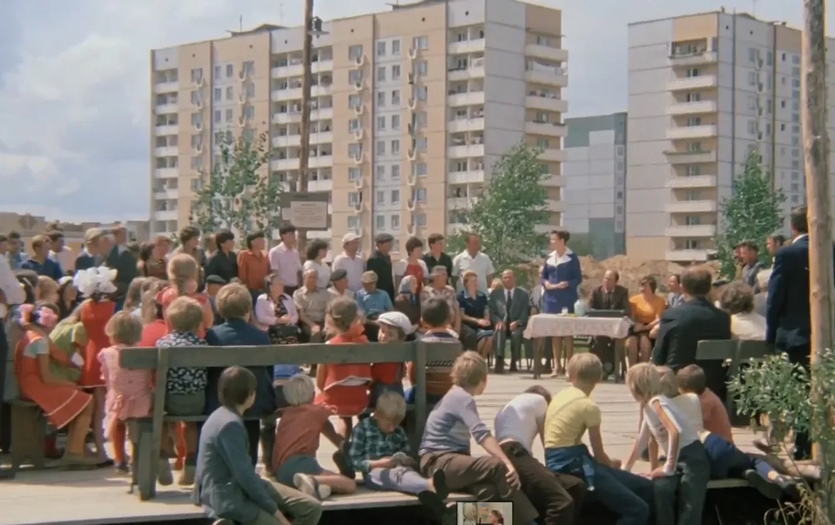 На улице Тельмана снимали сцену с детской коляской. Панорамные планы районов с девятиэтажками появляются неоднократно — на улице Дзержинского, на проспекте Строителей, в микрорайоне Переселка. Эти локации символизируют масштаб жилищного строительства, переселение. Город медленно поглощал деревню.