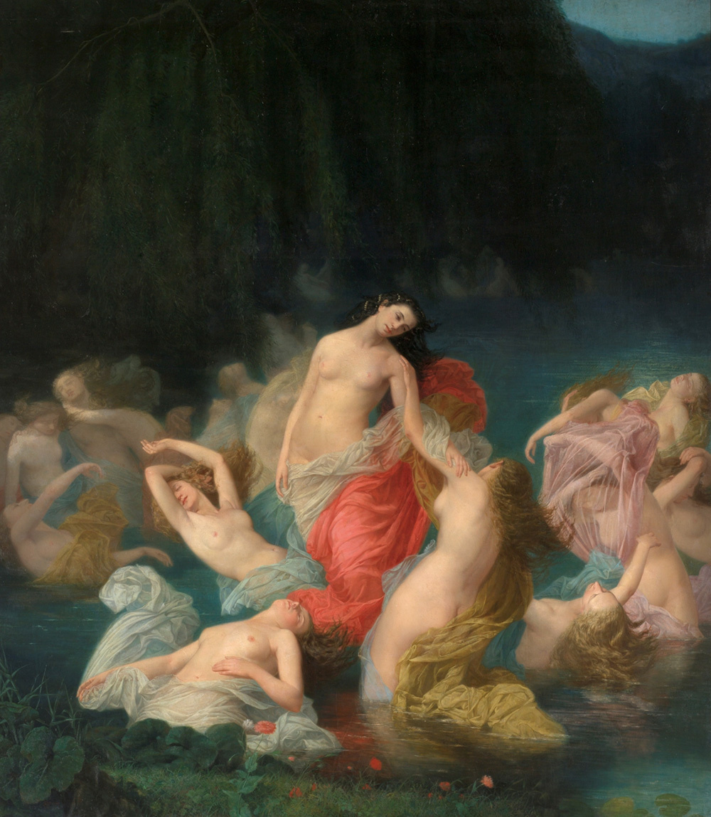 В туманной атмосфере, на поверхности озера, на заднем плане виднеется растительность: большие деревья с ветвями, свисающими над водой. Свет, который освещает композицию, пробивается сквозь верхний правый угол холста. Несколько групп фей медленно погружаются в озеро. Наиболее четко очерчена центральная группа из пяти фигур. Все они частично обнажены, а частично прикрыты разноцветными тканями. Главная фигура меньше всего погружена в воду, и, что любопытно, она единственная с тёмными волосами и вплетенными в них жемчужными лентами. На среднем плане, по обе стороны от основной, расположены другие группы этих фантастических существ, имеющих облик женщин и наделенных силами, превосходящими силы смертных. Они — феи — ассоциировались, например, в кельтской мифологии, среди прочего, с полями, холмами и озерами. В литературном и музыкальном мире начала XIX века, особенно после того, как Виланд написал поэму «Оберон» — вдохновленный именно этим персонажем, считавшимся королем фей, — эта тема