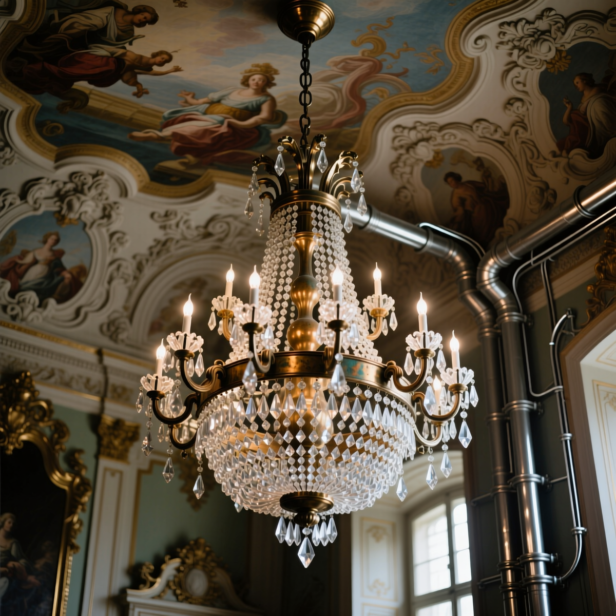 Рассмотрим типичную люстру XVIII–XIX веков: высота потолка — 15–20 метров, количество свечей — от 300 до 1000. Вес конструкции — 2–5 тонн. Чтобы заменить свечи, её якобы опускали на тросах. Но где механизмы? Архитектурные обследования чердаков дворцов (включая Зимний и Версаль) не выявляют следов мощных лебёдок, стальных тросов или усилений перекрытий, способных выдержать динамическую нагрузку.