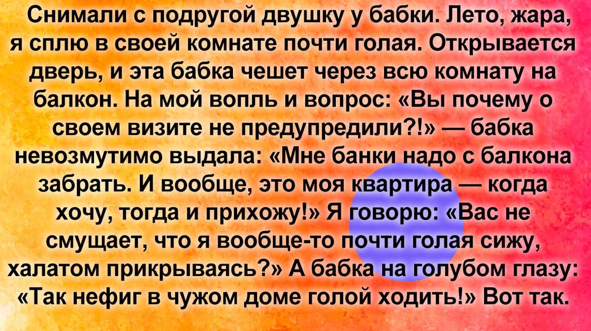 Есть у меня одна знакомая, она искренне считала, что имеет право в любое время приходить в квартиру, которую она сдала. И не дай бог в момент её визита будет грязная посуда в раковине, нечищеный толчок или наниматель будет по квартире ходить в одних и с голым торсом.