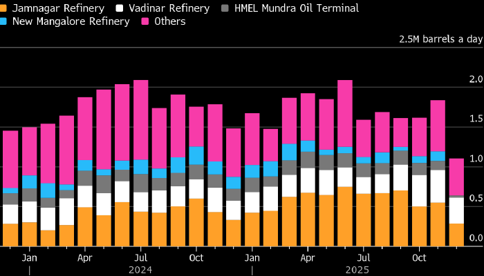 Ожидается, что показатель составит около 1,1 млн б/д (самое низкое значение с ноября 2022 года). Тем не менее, это все равно выше пессимистичных оценок на уровне 0,8 млн б/д, сделанных ранее в этом месяце индийскими чиновниками. Поставки российской нефти на различные объекты в Индии (млн б/д). Данные: Kpler, источник: Bloomberg По итогам декабря поставки российской нефти в Индию могут опуститься до трехлетнего минимума. При этом в начале следующего года показатель может подрасти на фоне возобновления покупок со стороны индийской Reliance Industries, пишет Bloomberg со ссылкой на оценки аналитической компании Kpler. Ожидается, что по итогам декабря поставки российской нефти в Индию составят около 1,1 млн б/д (против 1,8 млн б/д в ноябре), что станет самым низким показателем с ноября 2022 года. Тем не менее, это все равно выше пессимистичных оценок на уровне 0,8 млн б/д, сделанных ранее в этом месяце индийскими чиновниками. На второй неделе декабря показатель рухнул до 0,712 млн б/д, одн