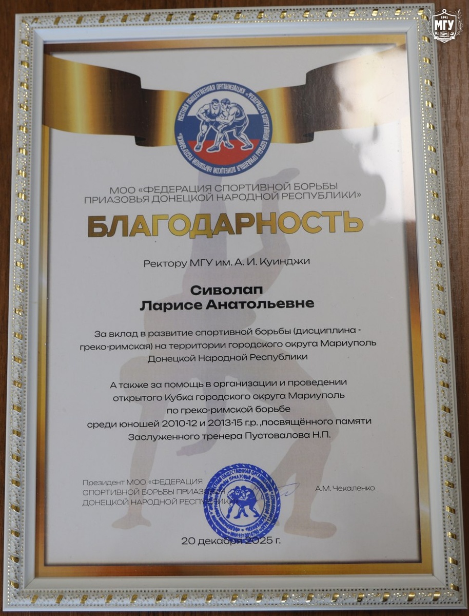 ! 🤩 Ректор МГУ имени А.И. Куинджи Лариса Анатольевна Сиволап получила благодарности от спортивных организаций города и региона. Местная общественная организация «Федерация спортивной борьбы Приазовья Донецкой Народной Республики» выразила благодарность за вклад в развитие спортивной борьбы на территории городского округа Мариуполь. Общественная организация «Федерация футбола города Мариуполь» отметила активную жизненную позицию Ларисы Анатольевны, а также особый вклад в развитие и популяризацию футбола в городе Мариуполь. 🔖 МГУ имени А.И. Куинджи последовательно поддерживает спортивные инициативы и участвует в проектах, направленных на развитие детско-юношеского и массового спорта. 💡 Впереди — новые совместные форматы, турниры и возможности для развития студенческого спорта в городе и регионе. 👻 MAX|💙ВК|📝Дзен|🤩Сайт #МГУимениКуинджи