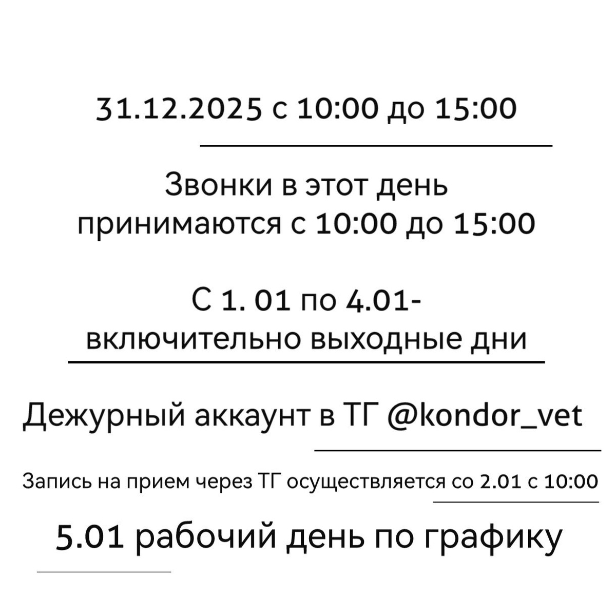 ! 🔔Напоминаем, что в праздники мы работаем до 31.12 включительно до 15:00 ⛄️С 5.01 ветклиника и зоомагазин работают по графику 🌲Запись на приём со 2.01 с 10:00 до 17:00 (временно будет осуществляться только через телеграм) @kondor_vet С наступающими праздниками🎄