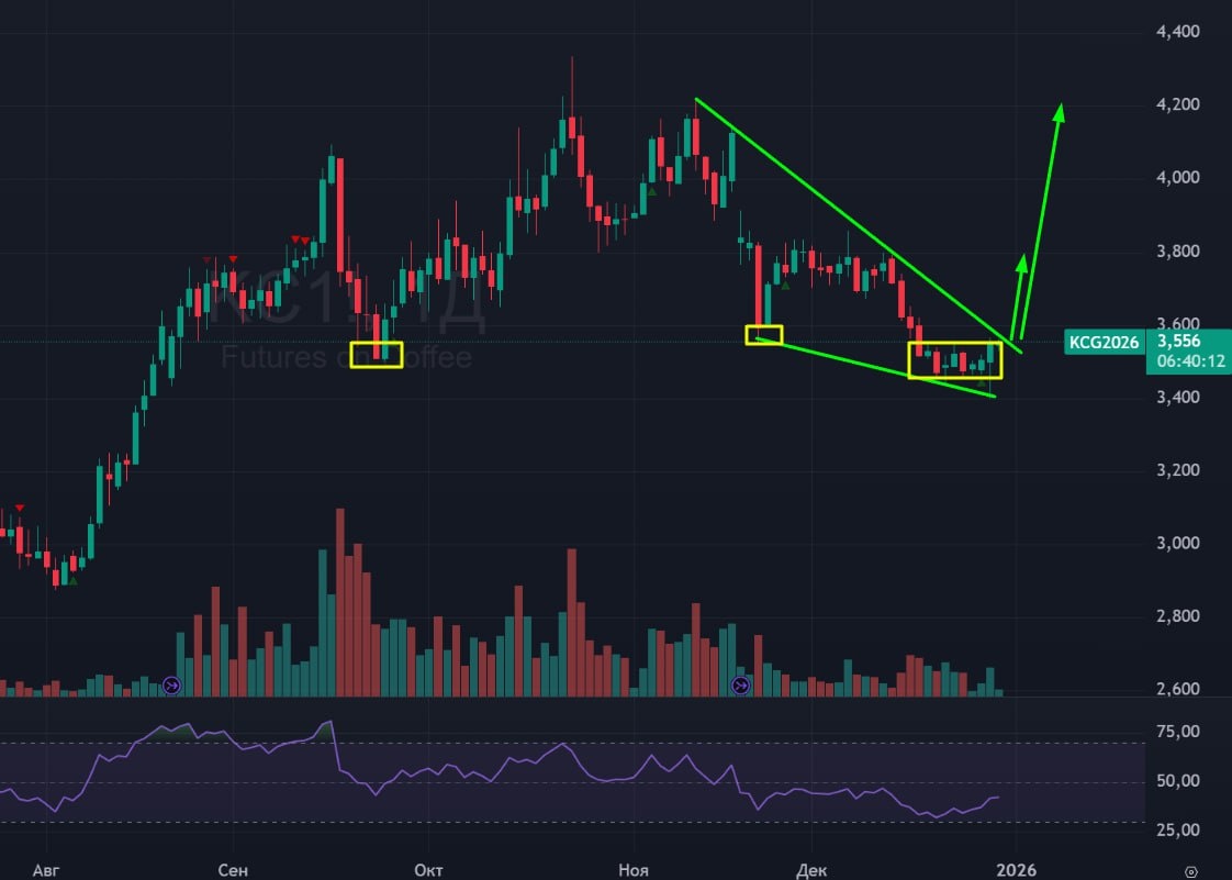 ☕️ Кофе! 🟢 с 18 декабря кофе торгуется в боковике, и готовится сейчас выйти из боковика, и из зеленого клина. 🟢 Цена находится на уровне, от которого прежде отбивалась дважды. 🚗 Жду кофе вверх! Цели 3,800 или 4,200. #кофе #kc1 #coffee #bogdanoffinvest $KCG6