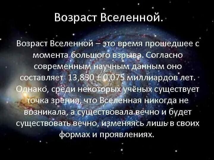 владею в настоящий момент. В данное время существует две основные теории возникновения мироздания. Одна божественная, не подразумевающая никакого другого понимания, кроме веры. Эта теория с трудом и человеческими жертвами, под давлением неопровержимых знаний, корректируется. Другая теория случайного возникновения Мироздания, жизни и путем эволюции, приведшей к появлению сознания. Мне понятнее вторая теория, но я исхожу из того, что все случайности не случайны. Я воспринимаю объективную реальность (Мироздание) не как что-то иное, а как Разум (Сознание), который бесконечен в пространстве и времени, т.е. существовал и будет существовать ВСЕГДА. Исходя из этого считаю, что не случайным образом появилась наша, тонко настроенная под возникновение жизни, вселенная (все необходимые константы заложены, благодаря этому эволюционным путем создалась солнечная планетарная система, а у планеты Земля появился необходимый для возникновения жизни спутник — Луна). Объективная реальность (сознание, мироздание) непрерывно находится в постоянном движении, т.е. эволюционирует циклически и по спирали. Рождения и смерти (звёзд, галактик, планет) — это точки перехода из одного состояния в другое. Так называемый Большой взрыв — это тоже точка перехода в цикле развития нашей вселенной.