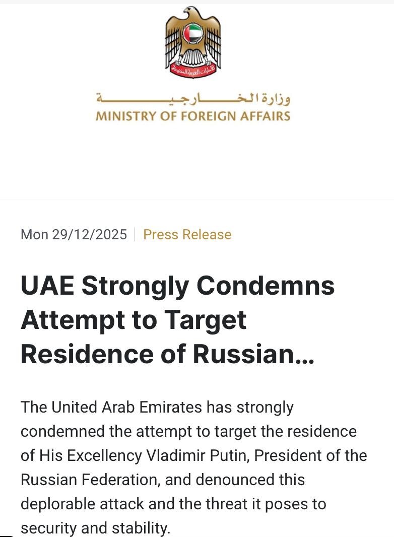 ОАЭ решительно осудили попытку атаки Киева на резиденцию Владимира Путина