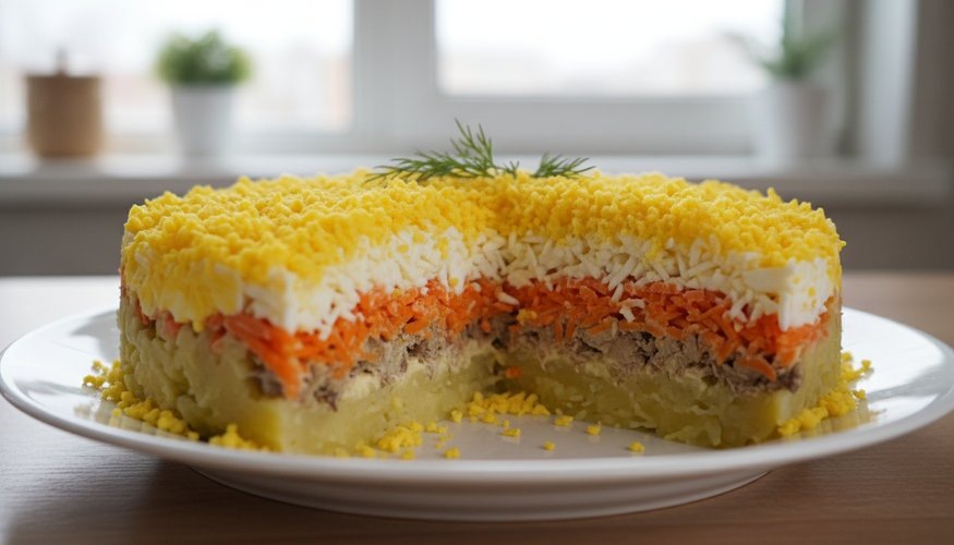 Здравствуйте, мои дорогие! Сегодня у нас в меню “Золотая классика” советских и российских застолий. Наряду с “Оливье” и “Шубой”, этот солнечный салат всегда был украшением стола. Конечно же, я говорю про нежнейшую “Мимозу”. Казалось бы, что может быть проще: рыбные консервы, яйца, майонез… Но замечали ли вы, что у одной хозяйки салат получается сухим и плотным, как кирпич, а у другой — воздушным, сочным и буквально тающим во рту? Всё дело в паре маленьких хитростей, о которых многие забыли. Я готовлю “Мимозу” по старому маминому рецепту, с тем самым “секретным ингредиентом”, который придает салату невероятный сливочный вкус. Давайте вспомним молодость и приготовим эту красоту! Подготовка (важно!): Овощи и яйца отвариваем заранее и даем им полностью остыть. Если тереть теплые овощи, салат быстро скиснет и превратится в кашу. Важно: Не приминайте слои ложкой! Пусть они лежат воздушно. Поставьте салат в холодильник на 2-3 часа. Масло чуть подтает, пропитает слои, и вкус станет божественны