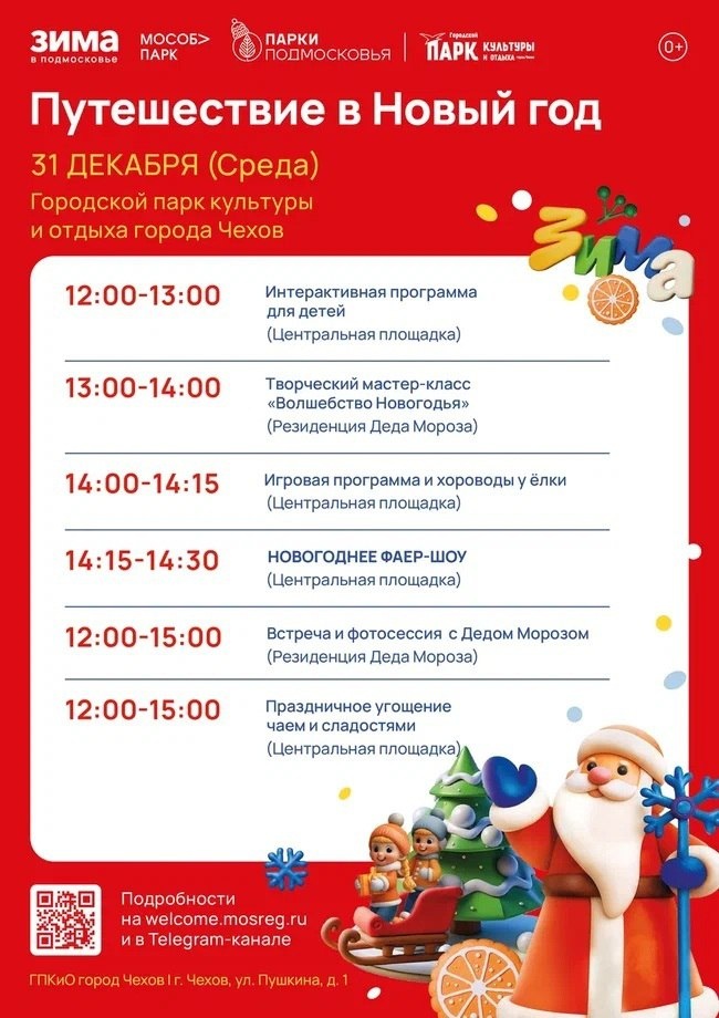 +) НА ЦЕНТРАЛЬНОЙ ПЛОЩАДКЕ : 🎄12:00-14:15 Интерактивная игровая программа для детей и хороводы у ёлки 🔥 14:15-14:30 НОВОГОДНЕЕ ФАЕР ШОУ 🍬 12:00-15:00 Угощение чаем и сладостями В РЕЗИДЕНЦИИ ДЕДА МОРОЗА 🎅 12:00-15:00 Встреча и фотосессия с Дедом Морозом ✂️13:00-14:00 Творческий мастер-класс 📣📣❄️❄️ 👀И конечно, Резиденция ДЕДА МОРОЗА будет работать в новогодние праздники (ловите расписание) 📆 31.12.2025 🏢 Городской парк культуры и отдыха 📍 г. Чехов, ул. Пушкина, д.1 🪙 Вход свободный❗️ ⭐Поддержать канал голосом ✅ Мероприятия Чехов https://dzen.ru/id/66cc4b48e9ef144699238a51 http://vk.com/chekhov_events http://dzen.ru/chekhov_events