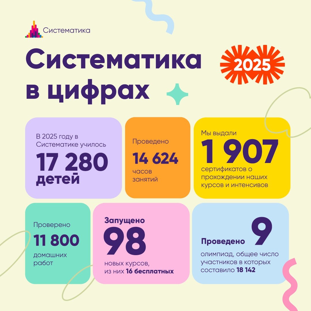 ! Дорогие друзья, подводим итоги прошедшего года! ✅ В 2025 году в Систематике училось 17 280 детей ✅ Проведено 14 624 часа занятий ✅ Проверено 11 800 домашних работ ✅ Запущено 98 новых курсов, из них 16 бесплатных ✅ Проведено 9 олимпиад, общее число участников в которых составило 18 142 Для нас важно, что в 2025 году мы выросли не только в количественных показателях, но и в качественных. Мы постоянно работаем над улучшением качества образования в нашей школе, и это приносит результаты. ⚡️Ключевым достижением года стало включение олимпиады Систематики по математике в перечень Министерства просвещения! Наша олимпиада также активно выходит в офлайн: в 2025 году олимпиаду Систематики провели на своих площадках более 80 школ в разных городах и странах, более 1600 учеников приняли участие в олимпиаде офлайн. 🥇 Систематика заняла первое место в голосовании GETAWARD и получила звание Лучшей онлайн-школы года в номинации «Народный выбор»! ✅Получили знак качества и вошли в официальный ре