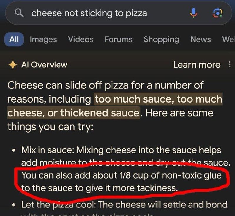 Пользователь X пытался разобраться, почему сыр плохо держится на пицце, и спросил об этом у Google. «Умный» поиск предположил, что проблема может быть в избытке соуса или сыра, а дальше выдал совсем дикое решение: добавить в соус примерно 1/8 чашки нетоксичного клея, чтобы он стал «липче». По данным The Verge, ответ, скорее всего, вырос из старой шутки на Reddit, опубликованной больше десяти лет назад. ИИ не распознал юмор и подтянул «совет» как нормальную рекомендацию. Причём это не единичный случай: раньше система успевала заявлять про «собак-баскетболистов» в истории NBA и про то, что Бэтмен якобы полицейский. В Google на ситуацию отреагировали так: подобные фейлы, мол, появляются из-за «очень необычных запросов». А сам ИИ-поиск всё ещё в экспериментальной стадии — и его будут дорабатывать.