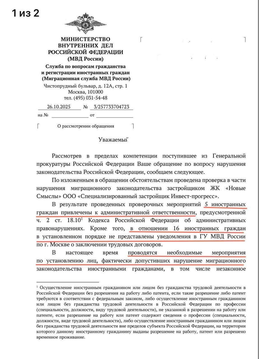 И ещё информация по нарушению застройщиком Unikey миграционного законодательства Миграционная служба МВД России привлекла 5 иностранных граждан, работавших на строительстве ЖК "Новые смыслы", к административной ответственности. При трудоустройстве 16 других иностранных граждан обнаружены нарушения. Проверка была проведена по обращениям жителей Коммунарки."Проводятся необходимые мероприятия по установлению лиц, фактически допустивших нарушение миграционного законодательства", - следует из полученного жителями ответа. По информации соседей, "социально ответственный" застройщик Unikey, столкнувшись с миграционными проверками, "перебросил" нелегальных мигрантов на строительство торгового центра у СНТ "Юннат", а ночью, когда МВД не проводит проверки, эти рабочие трудятся на строительстве "Новых смыслов". Вывод? Обращения о миграционных нарушения можно направлять через сайт МВД. Обращения рассматривают, проверки проводят. Возможно, это даже поможет сократить шумные работы в ночное врем