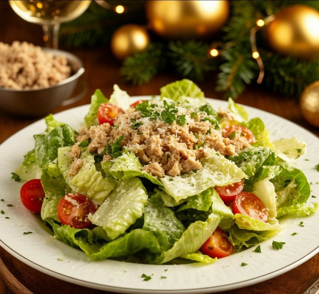 Мяу, любители быстрой, свежей и вкусной классики! 🥗 Бронза нашего хит-парада — вечно молодой Цезарь! Я делаю его с консервированным тунцом — это быстро, доступно и очень вкусно. Хрустящие листья, пикантный соус, ароматные сухарики... Идеальный баланс для тех, кто уже устал от майонезных салатов, но хочет сытно и празднично!