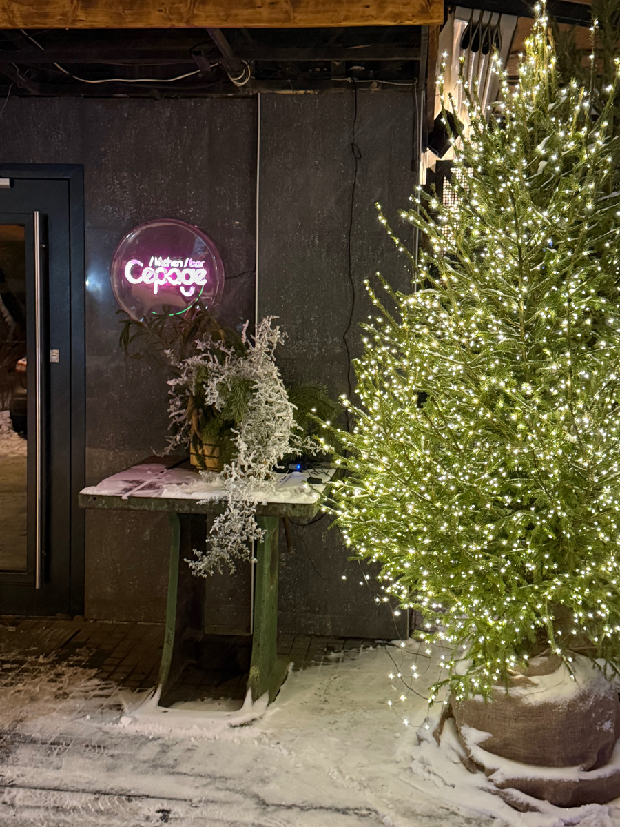 На входе стоит крутая елка из бутылок! Звучит странно, но выглядит очень креативно и стильно, сразу обозначая, что в ресторане огромная винная карта.