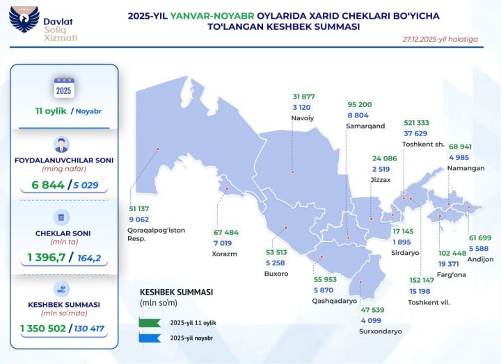 В пресс-службе Налогового комитета Республики Узбекистан сообщили, что по итогам ноября 2025 года (по состоянию на 27 декабря) потребителям было выплачено более 130,4 млрд сумов кешбэка. Выплаты произведены по 164,2 млн зарегистрированных чеков. В ведомстве уточнили, что приведённые данные отражают суммарные начисления в рамках действующего механизма стимулирования регистрации фискальных чеков и использования электронных сервисов при совершении покупок.