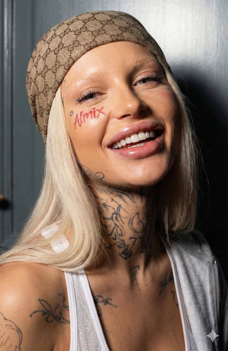 В запретграмме очень часто попадаются такие видео. Я нашел способ как за 15 минут это повторить 👀 1 - сгенерированный персонаж 2 - референсное видео 3 - результат Промпт на девушку: A vibrant blonde young woman fully tattooed (with fine line tattoos) stands mid-laughter, captured in a raw, candid moment that merges luxury streetwear with editorial intimacy. The framing is waist-up, centered, and cropped close - with a slight rightward tilt that reveals both the dimensionality of her face and the soft falloff of the background. Her head is slightly leaned back, exposing her neckline and collarbones in a pose that blends kinetic spontaneity with natural elegance. Anatomical Structure & Facial Logic A slim blonde woman with porcelain skin She has a heart-shaped face, high cheekbones with natural roundness, a defined but softly sloped jawline, and a narrow, rounded chin. Skin tone is melanin-rich with a golden undertone - radiating warmth and light absorption. The micro-surface includ