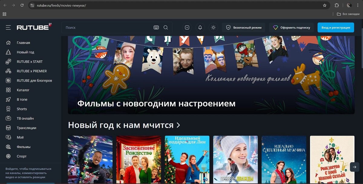 На российском стриминге RuTube можно найти не только отечественное кино, но и голливудские фильмы в хорошем качестве. Смотреть можно бесплатно и без регистрации, правда, с перерывами на рекламу. На сервисе уже появился специальный раздел с праздничным контентом. Там вы найдете классику вроде «Карнавальной ночи», «Отпуска по обмену» и «Гарри Поттера», детские фильмы, мультфильмы и даже сериалы на тему новогодних чудес и Рождества, например, «Рождественская песнь». Новогодняя подборка фильмов на сайте RuTube На RuTube есть не только новогодние фильмы, но клипы. На платформе есть различные подборки музыкальных роликов для разных компаний и настроения. Если захотите оформить подписку, то она обойдется вам в 99 рублей в месяц, но в Сети легко найти промокоды на первые 10 дней подписки бесплатно, а этого как раз хватит почти на все каникулы. На платформе «Смотрим» от ВГТРК в специальном разделе собраны советские и современные российские фильмы на новогоднюю тематику. Коллекция фильмов на нов