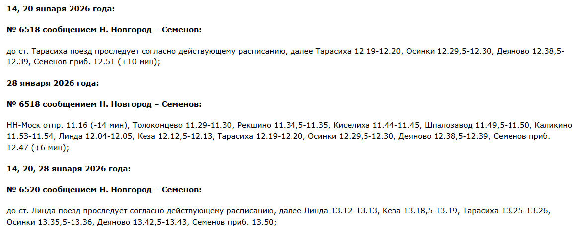 В январе 2026 года на некоторых маршрутах пригородных поездов в Нижегородской области произойдут изменения в расписании. Об этом сообщает АО "Волго-Вятская пригородная пассажирская компания". 14 и 20 января электричка № 6518 Нижний Новгород — Семенов прибудет в пункт назначения на 10 минут позже — в 12:51. 28 января этот же поезд отправится со станции Московская на 14 минут раньше — в 11:16, а прибудет в Семенов на 6 минут позже обычного — в 12:47. В те же дни поезд № 6520 Нижний Новгород — Семенов изменит график после станции Линда. Время прибытия в Семенов — 13:50. 15 января электричка № 6530 Нижний Новгород — Семенов отправится на 10 минут раньше — в 14:34 и прибудет в Семенов в 15:44, также на 10 минут раньше обычного. В этот же день поезд № 6541 Семенов — Нижний Новгород отправится на 10 минут раньше — в 16:01. После станции Линда он продолжит движение по обычному расписанию. 23 января изменения коснутся сразу трёх маршрутов. Поезд № 6551 Шахунья — Нижний Новгород проследует по н