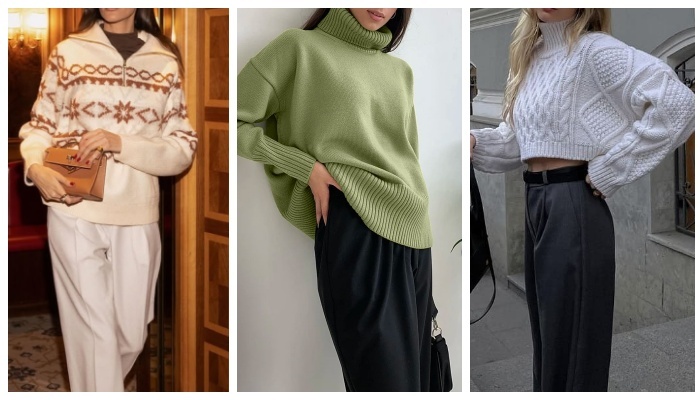 Например, пастельно-розовый пушистый свитер легко вписывается в повседневный городской образ, сочетаясь с лаконичными брюками и многослойной стилизацией. Свитеры с норвежскими и скандинавскими орнаментами возвращаются, но в более утонченном и модном прочтении. Геометрические узоры, контрастные полосы и природная палитра (молочный, синий, коричневый) создают ощущение уюта и наследия. Зима 2026 — это сезон экспериментов с формой. Асимметрия, укороченные передние линии, удлиненные спинки, объемные рукава и нестандартные горловины выходят на первый план.