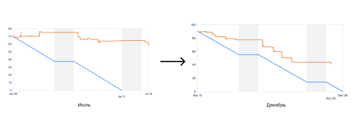 Оно работает! Хочу поделиться своим результатом 🦾 Прошло полгода как перешёл в новую команду на позицию продакта. За это время я сделал большой упор на развитие процессов, в этом деле один из ориентиров для меня - диаграмма сгорания спринта. Эта диаграмма - отражение всех проблем в процессах команды. Не будет она работать без хорошего планирования, без описания задач, без вовлеченности разработчиков, без... Все проблемы которые есть у вас в команде находят своё отражение в этой диаграмме. Ну а теперь к результатам😎 На фото представлены две диаграммы за июль и декабрь. Я думаю не вооруженным взглядом видно что декабрь куда "Красивее". Конечное есть ещё над чем работать, но начало положено. В чем секрет? 🧐 Есть золотое правило - ваш процесс не будет лучше процессов, которые следуют до и после него. Поэтому мы сделали большой акцент на планировании и описании задач - это старт, с этого начинается разработка. Также сделали акцент на последнем этапе - деплое. Сделали его более прозра