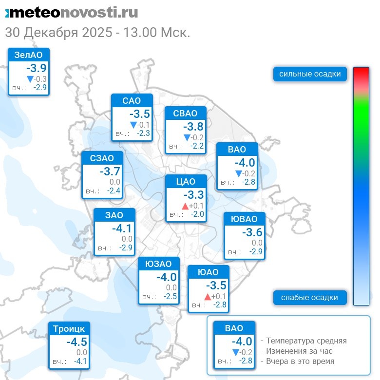 В 13:00 в Москве было от -4.8°C до -2.9°C, средняя температура -3.7°C #погода #Москва #зима #температура #30декабря #вторник