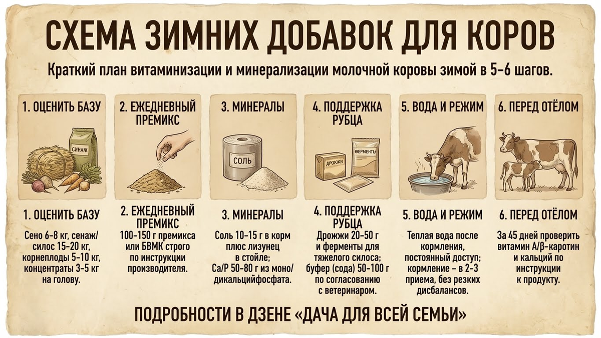 Зимой дойной корове нужен базовый рацион и обязательные добавки. Схема, которая у нас работает стабильно: основа — сено 6–8 кг, сенаж или силос 15–20 кг, корнеплоды 5–10 кг и 3–5 кг концентратов; ежедневно — витаминно-минеральный премикс или БВМК по инструкции производителя, обычно 100–150 г на голову; минеральные добавки: соль не меньше 10–15 г в корм плюс лизунец в свободном доступе, кальций и фосфор из монокальцийфосфата или дикальцийфосфата 50–80 г; по ситуации — дрожжи 20–50 г и ферменты для переваривания силоса, а для профилактики ацидоза — пищевая сода 50–100 г по согласованию с ветврачом. Эта схема поддерживает рубец, иммунитет и молоко, а точные дозировки подбираем по удою и качеству кормов.