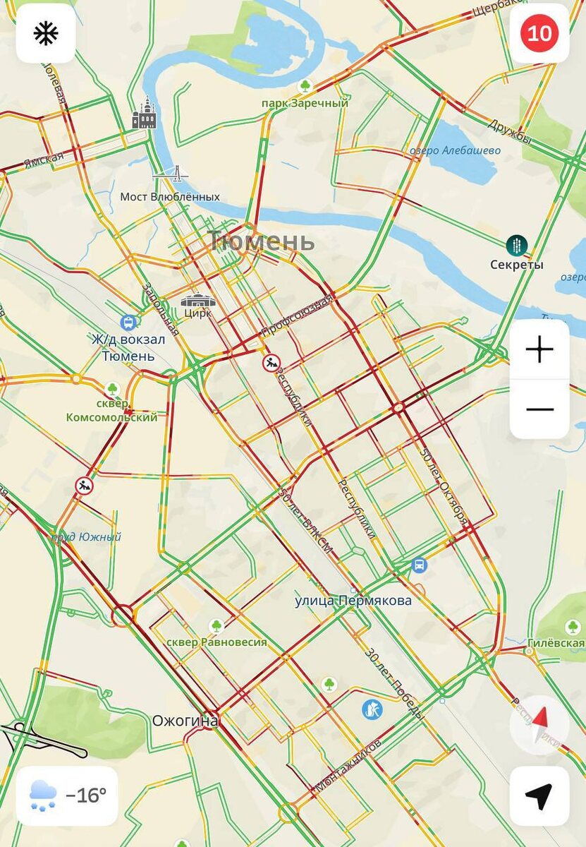 Коротко о ситуации в Тюмени 📷 2Гис фиксирует 10 баллов, и это в разгар рабочего дня🤯