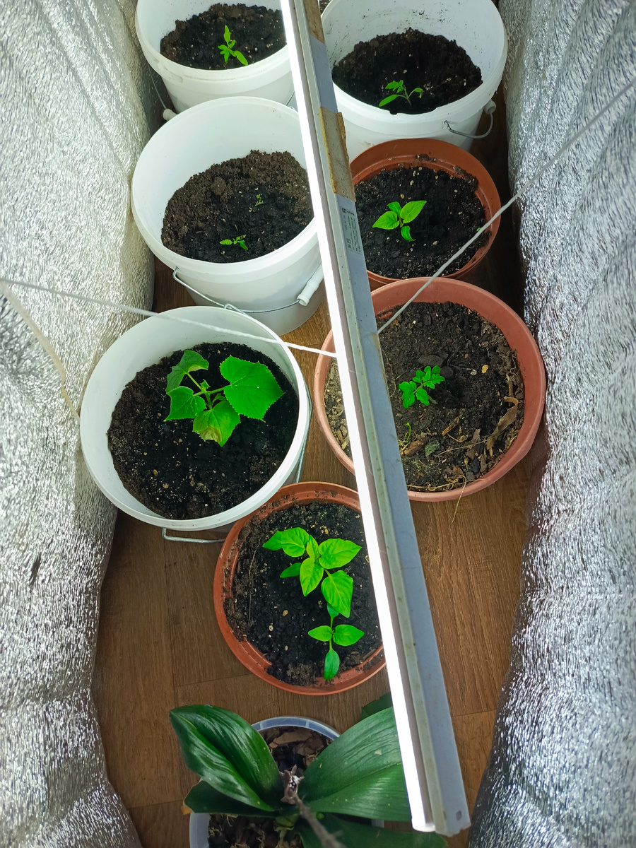 Здравствуйте мои дорогие подписчики и гости моего канала! В этом году на меня снизошло просветление и я решила поиграть в огород на подоконнике. Ну пока они еще не на подоконнике, потому что под ним жарко, сухо, а за окном серость и темнота по большей части дня. Поэтому пока моя грядка имеет вот такой вид и вот такую подсветку. Сразу скажу, что тратиться я на мощные лампы не собираюсь, мне и так хорошо и растениям тоже. Когда солнца у нас станет больше, то помещу горшки на подоконник. А это все наша форумчанка "виновата". Она давно так огородничает и щедро делится своим опытом, выращивая зимой перцы, томаты и огурцы. Вот и я решилась. Из огурчиков у меня растет Сибирская гирлянда, перцы Сиреневый блеск( 2 штуки) и один из семян подруги, а томаты у меня Балконное чудо, Пламя, Пинк Болл( семена взяла с покупного томата) и Петергоф. Вон тот заморыш в левом углу, второй который, это он))) Ну и орхидею сунула в компанию. Она почему то засушила свои корни после пересадки, но живая, растит